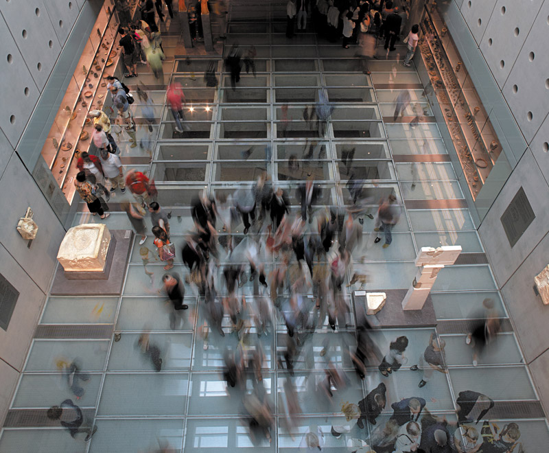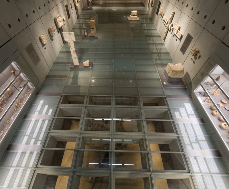 The gallery’s upward sloping floor reflects the nature of the path that someone in antiquity would have followed as they ascended the Acropolis Rock, while glass panels in the floor allow Museum visitors to enjoy a visual connection with the archaeological excavation exhibited just below.