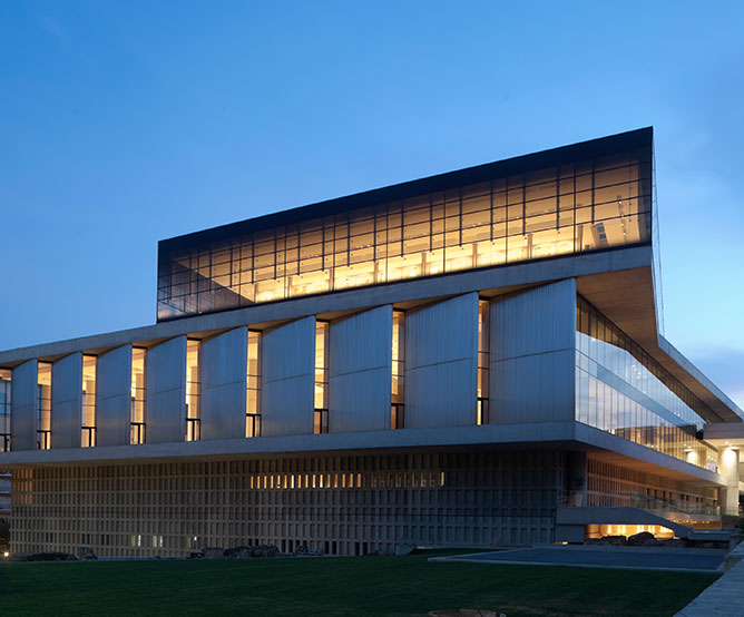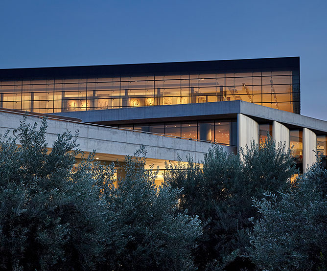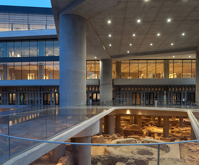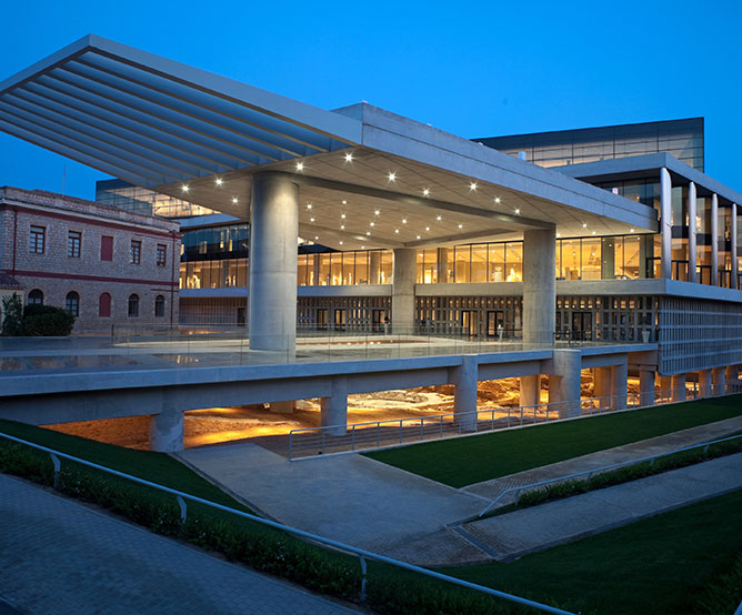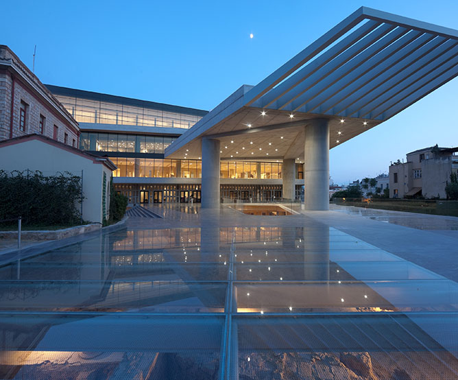 Η αρχιτεκτονική του Μουσείου επιδιώκει με τόλμη, χρησιμοποιώντας υψηλής διαφάνειας υαλοστάσια, την οπτική σύνδεση των εκθεμάτων του με τον βράχο και τα μνημεία της Ακρόπολης. Συγχρόνως, επιτρέπει την πανοραμική θέαση των ιστορικών λόφων και των βουνών της Αττικής, αλλά και του σύγχρονου αστικού περιβάλλοντος. Παράλληλα, χάρη στα γυάλινα δάπεδα στο εσωτερικό του, είναι ορατός ο αρχαιολογικός χώρος που εκτείνεται στα θεμέλιά του. Με τον τρόπο αυτό το Μουσείο δεν απομονώνεται, αντίθετα γίνεται η συνέχεια του φυσικού και δομημένου περιβάλλοντος και δηλώνει τη σχέση του με αυτό.